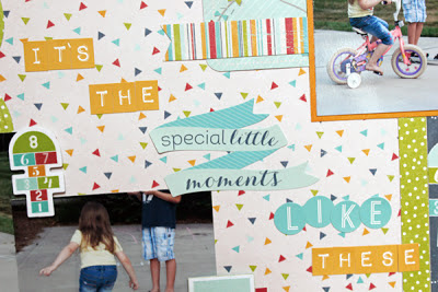 So back to why I'm here today....this week Imaginisce is having a release party for Childhood Memories! And WOW....what a collection this is! I think this has to be one of my all time favs from Imaginisce!! It's so fun and playful with all of the great colors and patterns! The first thing I noticed about it were the adorable hopscotch boards on the papers and stickers. I immediately thought about the day when the kids and I spent hours playing outside in the drive way riding our bikes and playing hopscotch. I fussy cut the bicycle and some Polaroid pics because they are just so darn cute and I knew they would look good!