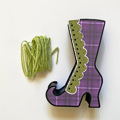 How cute is this?!?! It laces up just like a real boot and was fun to decorate. I'm so excited to have this to add to my Halloween home decor this year! So if you want one for your own decor, gather your supplies and follow along with my tutorial. And if you are wondering, I used the Halloween Magic collection for this project because I had to have the gorgeous purple plaid for the main part of the boot.
